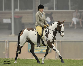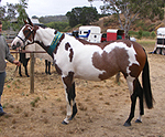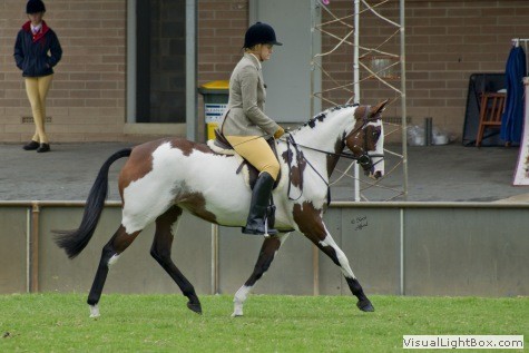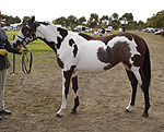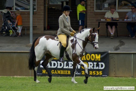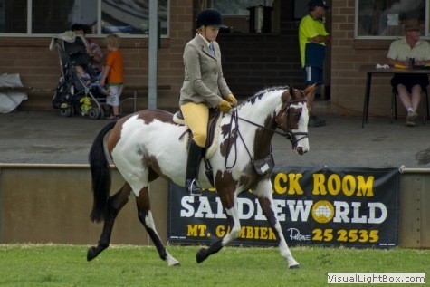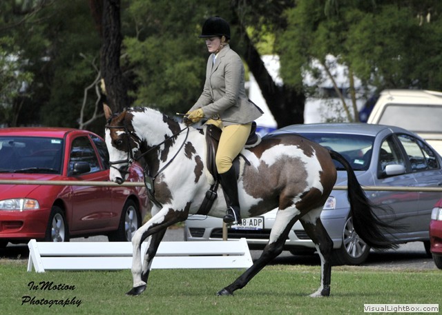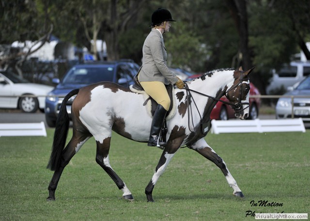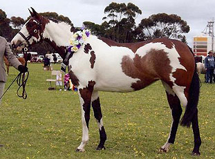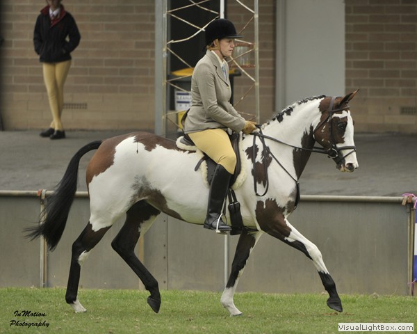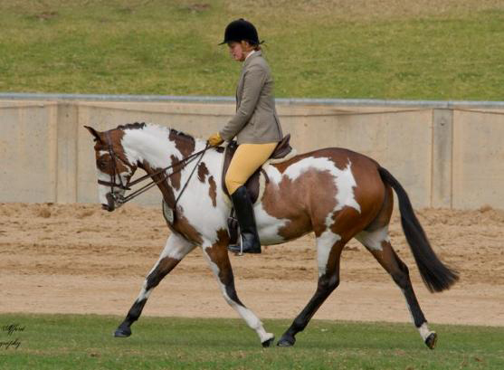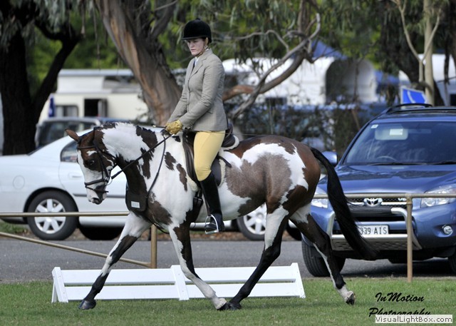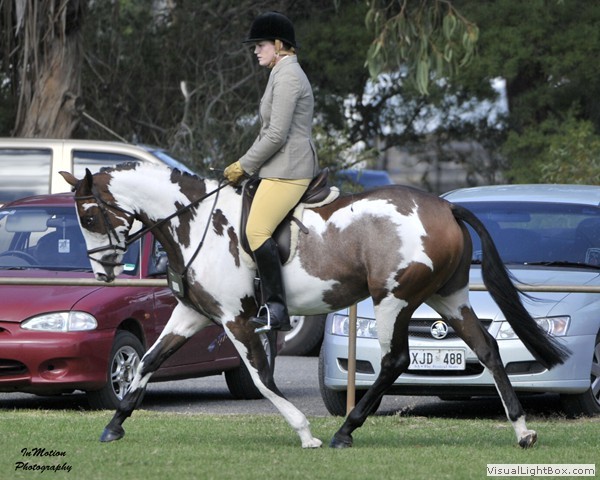 Jive has a very friendly and easy going temperament. She is also registered Paint Horse, ANSA and Pinto Association SA. She was the winner of the High Point Yearling Versatility Award at the SA State Paint Horse Show 2008, winning the Yearling lungeline Futurity and Yearling Trail classes. As a 2yo Jive was second in the ASH 2yo Filly Futurity and Supreme Led Pinto at the two pinto shows she contended (APSB Youngstock Show and Strathalbyn Hunt Club show). She was also Champion Led ANSA (all ages) at the Strathalbyn Hunt Club Show. Jive started the 2009 show season with great success, being Supreme Led Pinto at Gawler Ag Show. She was then Supreme Champion Led Pinto, Supreme Champion Led ASH, Supreme Paint and Reserve Champion ANSA at the Southern Equestrian Show (Strathalbyn 4/10/09). She took out many further Supreme Led Pinto awards as well as ASH led Champions that season. The 2009/2010 season culminated in Jive winning the High Point Versatile pinto, High Point Pinto mare and Overall Led High Point Pinto as well as High Point Junior Led ASH. She earned a name inscribed rug, saddlecloth, halter and trophies for her efforts. After a hoof injury in Aug 2010 that put her out of action for some months, Jive started showing under saddle in the Open Hack ring in Hack and Show Hunter classes. She qualified for Adelaide Royal Show in Show Hunter classes, having won and placed in Hack and Show Hunter events at Agricultural shows in 2011. She turned many heads and received many favourable comments from Hack competitors and Judges. At the Adelaide Royal Show in 2011, Jive competed in the Show Hunter Hack classes for a call in the Open Show Hunter 15-16hh and the Child's Show Hunter over 15hh (with Chari-Lee Hoad riding). She also placed in all her ASH classes she competed in (2nd Led ASH mare, 4th ASH Hack, 5th ASHLA, 3rd Stockman's turnout, 2nd Ridden ASH mare, 3rd Station Horse). Jive is sired by the very successful Vancouver Park Watch My Duco (ASH, Paint and Pinto registered) who was Champion ASH Hack at the National ASH Championships Albury 2002. See the Vancouver Park website for further details on her sire. ![]() More photos of Jive are available on the Chalani Australian Stock Horses Facebook page.